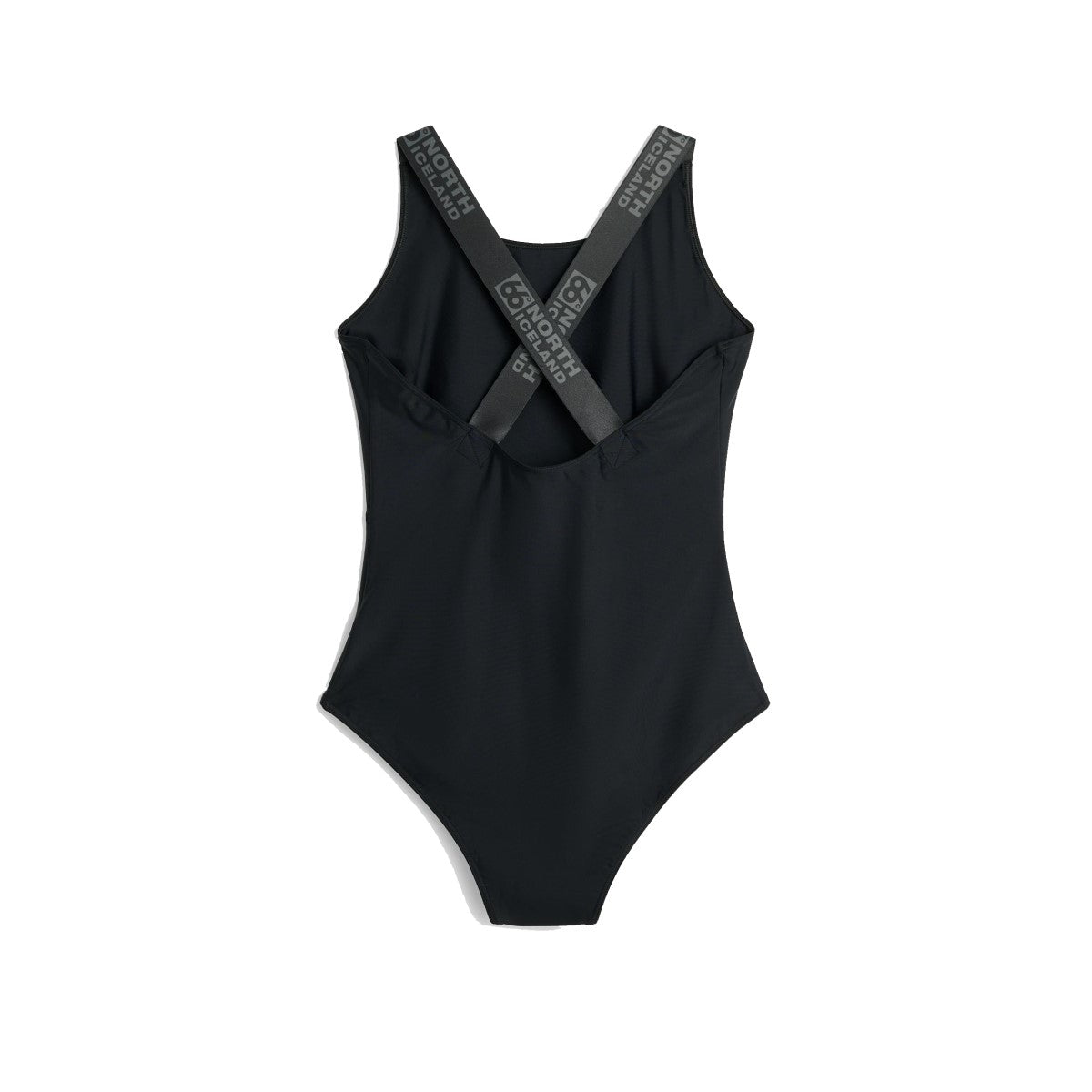 A classic black swimsuit from 66 North with logo along straps.