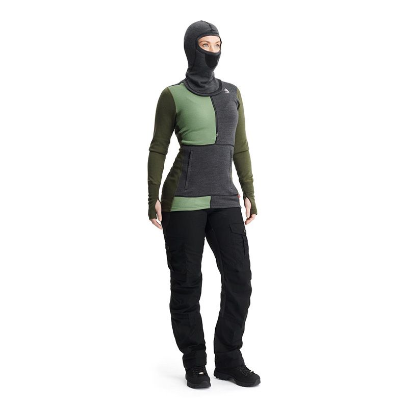 The hood featured can be worn as a neck warmer, hood or balaclava depending on conditions. The arms and waist of the warmwool hoodie are elongated for added warmth and protection.