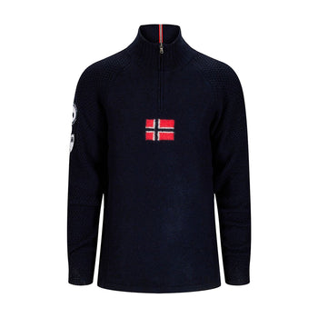 The new ski sweater from Amundsen is carefully knitted with a boiled wool body. With a windproof and warm front for extra protection to keep your core warm. Featuring a knitted Norwegian flag on the chest, a great traditional ski sweater to keep you comfortable on the slopes.
