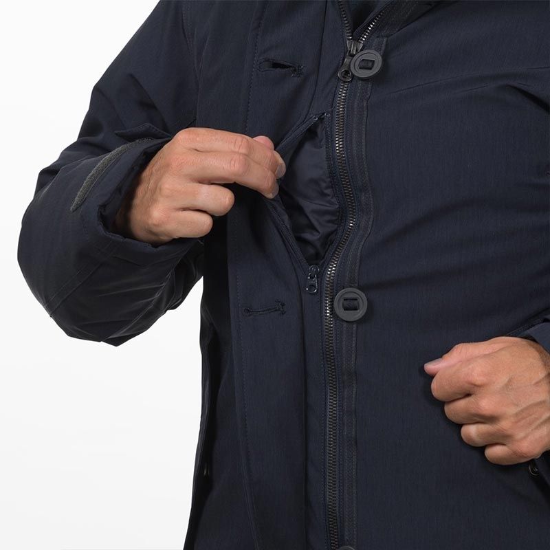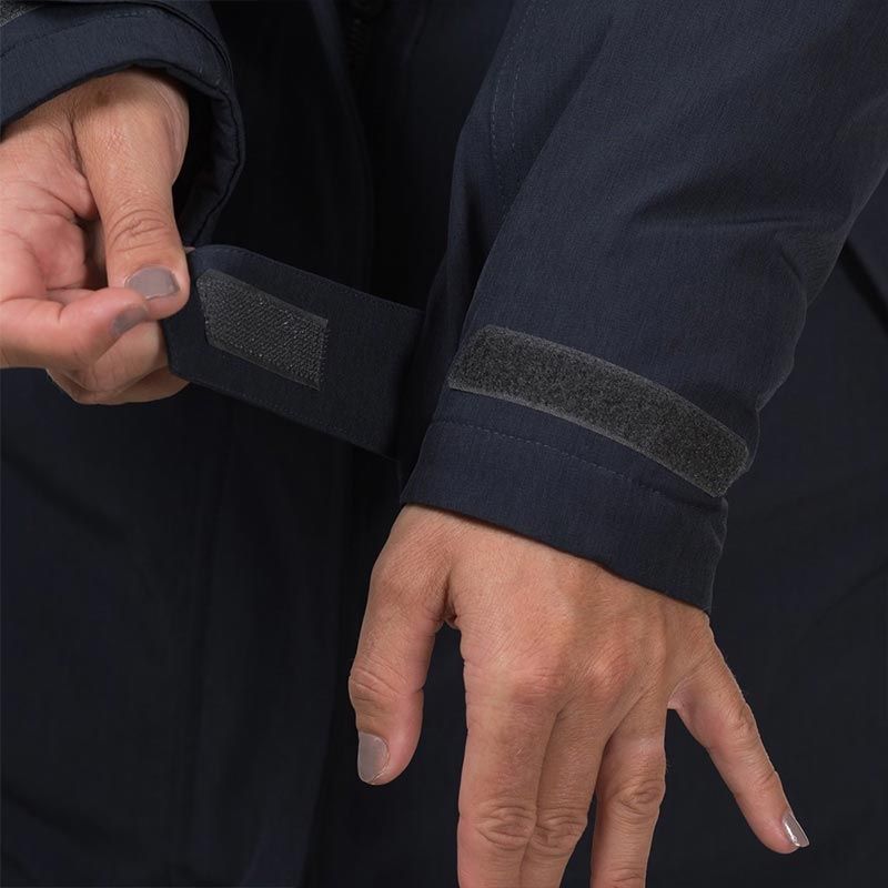 Waist tightening accessed from the pockets. Velcro wrist adjustment. 2-way zip in front.
