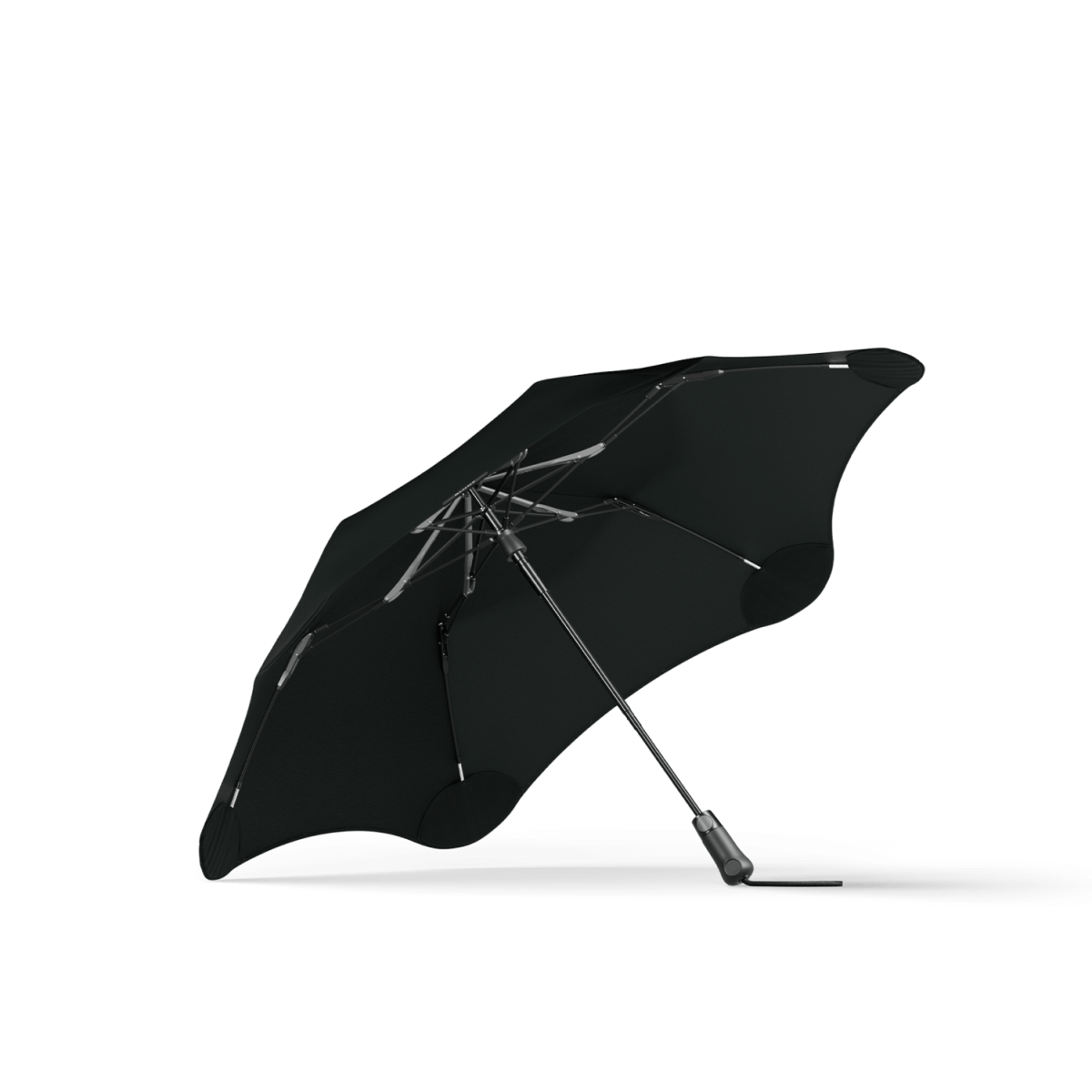 The BLUNT Umbrella frame features a unique strut mechanism that stresses the ribs, creating an effortless outward tension in the canopy as the umbrella is opened.