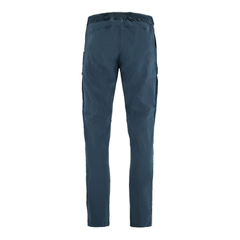 The Abisko Hybrid Trail Trousers from Fjallraven have G-1000 Lite Stretch on the front and a technical stretch fabric on the back. The front can be waxed for enhanced weather resistance while the back is highly breathable, and the stretch fabric gives great movement. The elasticated waist further enhances comfort and fit. Zippered ventilation openings at side, open hand pockets and buttoned leg pockets, one with a zipper. The perfect light hiking trousers for the warmer months.