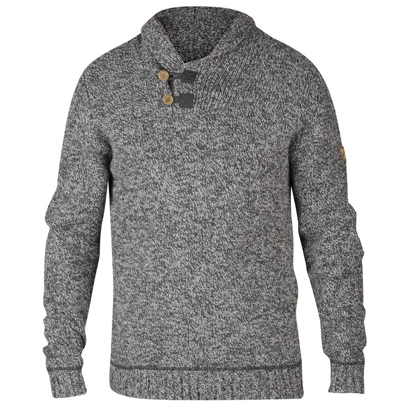 Fjällräven Lada Sweater Knitted sweater in lambswool blend with classic shawl collar and slightly marbled yarn. Perfect for everyday use over a shirt or as a warm middle layer on an autumn/winter walk. Corozo buttons and eyelets in G-1000 Original. Ribbed sleeve cuffs and hem. Leather logo on the sleeve. Regular fit.